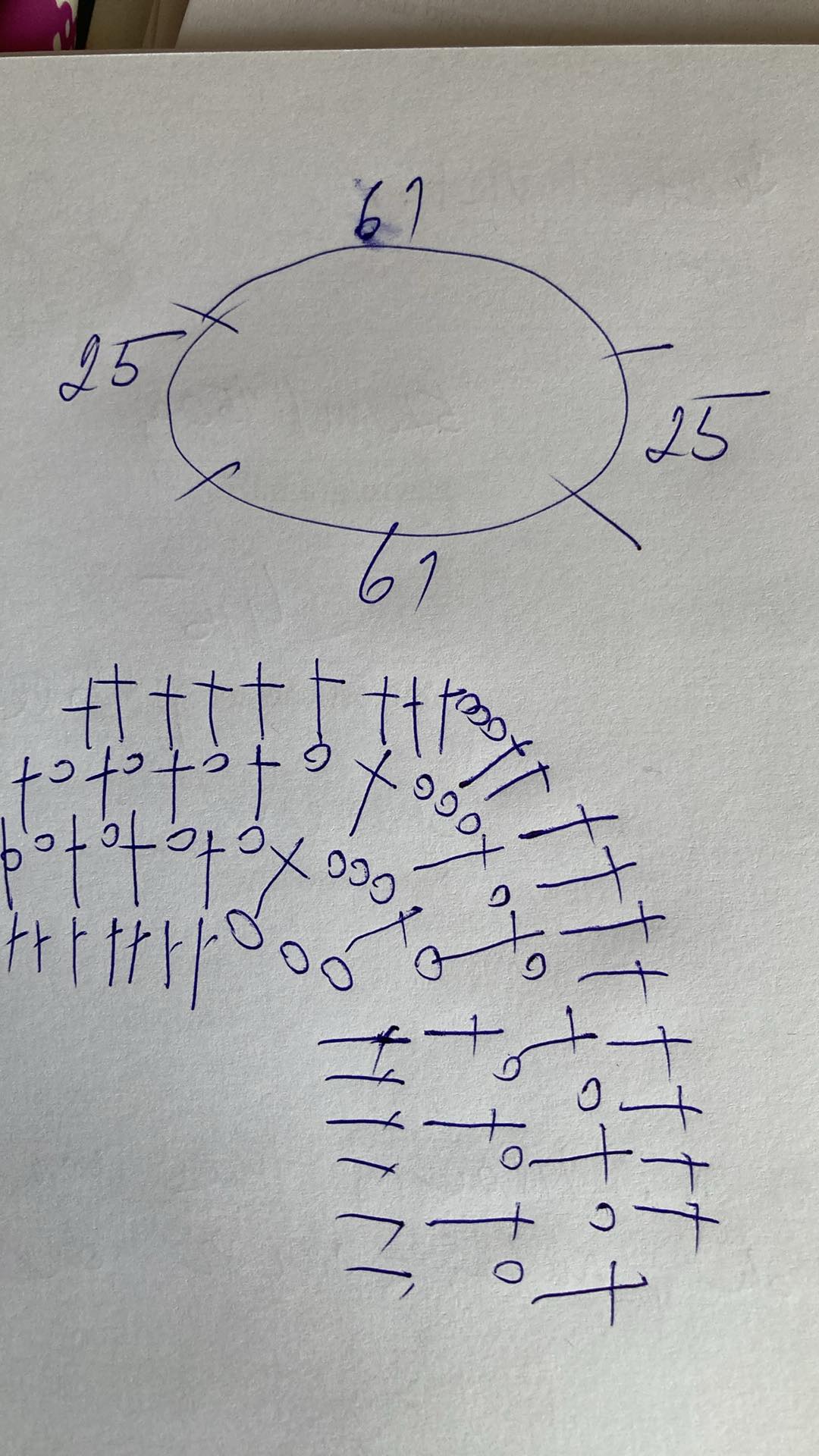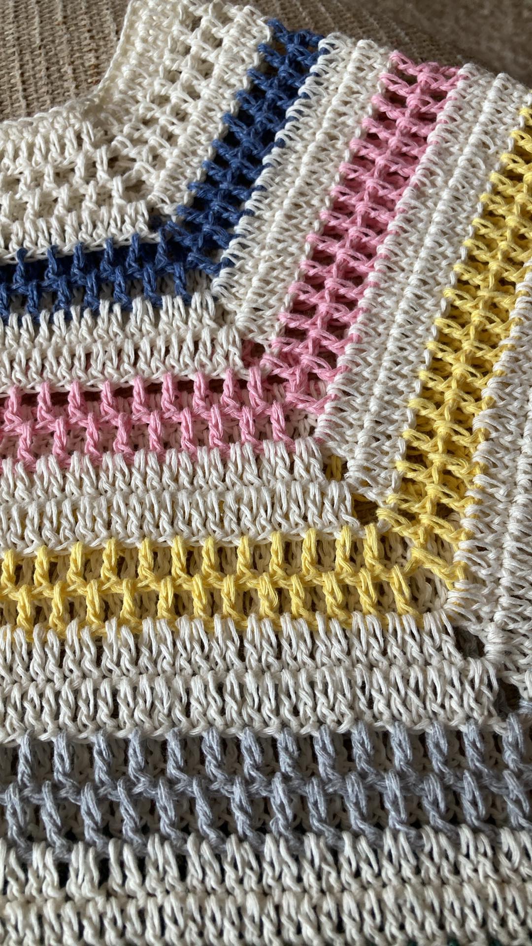 Začátek je na 172 ok, dělení vidíte na fotce níže. První řada jsou PDS, druhá řada DS a mezi jednotlivými díly (záda, předek a 2x ramena) háčkujeme 3 ŘO. Střídání barev je vždy po dvou řadách kromě začátku a konce. S barevnými pruhy můžete naložit, jak je libo. Můžete háčkovat třeba jednu řadu jen DS a druhou okýnkovou nebo okýnkové obě. Smetanové pruhy jsem háčkovala vždy dvě řady DS.