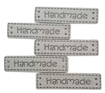 Štítky s nápisem Hand Made k našití z kůže, barva světlá šedá, velikost 40x10mm.