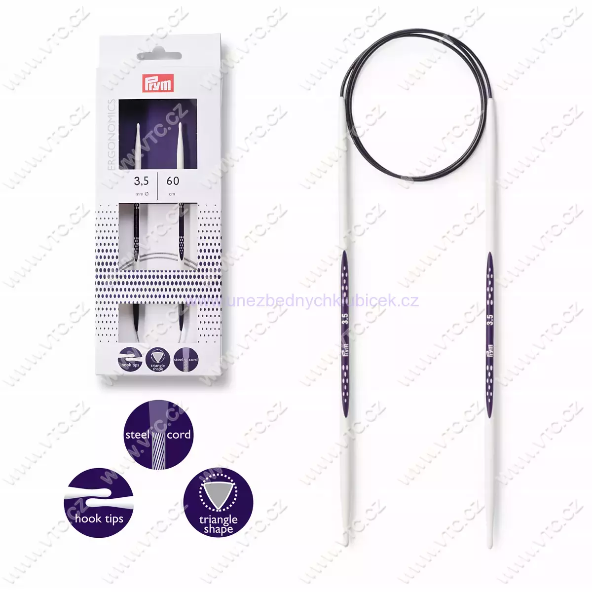 Revoluční kruhová pletací jehlice z vysoce funkčního syntetického materiálu. Ergonomická, velmi lehká a nehlučná. Špička ve tvaru kapky umožňuje jednodušší zachycení příze a hladké vedení jednotlivých ok, což je podpořeno i trojúhelníkovým profilem jehlice. Jehlice jsou spojeny ocelovým, plastem potaženým lankem, které je pevné, ale zároveň i jemné, poddajné a bez nepříjemné tvarové paměti. Délka 80 cm, průměr 3,5 mm. Německý výrobek.