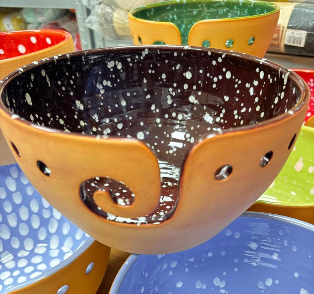 Miska na klubíčka - klubíčkovník - průměr 16cm, výška 9cm. Vnitřní glazura hnědá s bílýma kapkama. Otvory kulaté, s trnem.