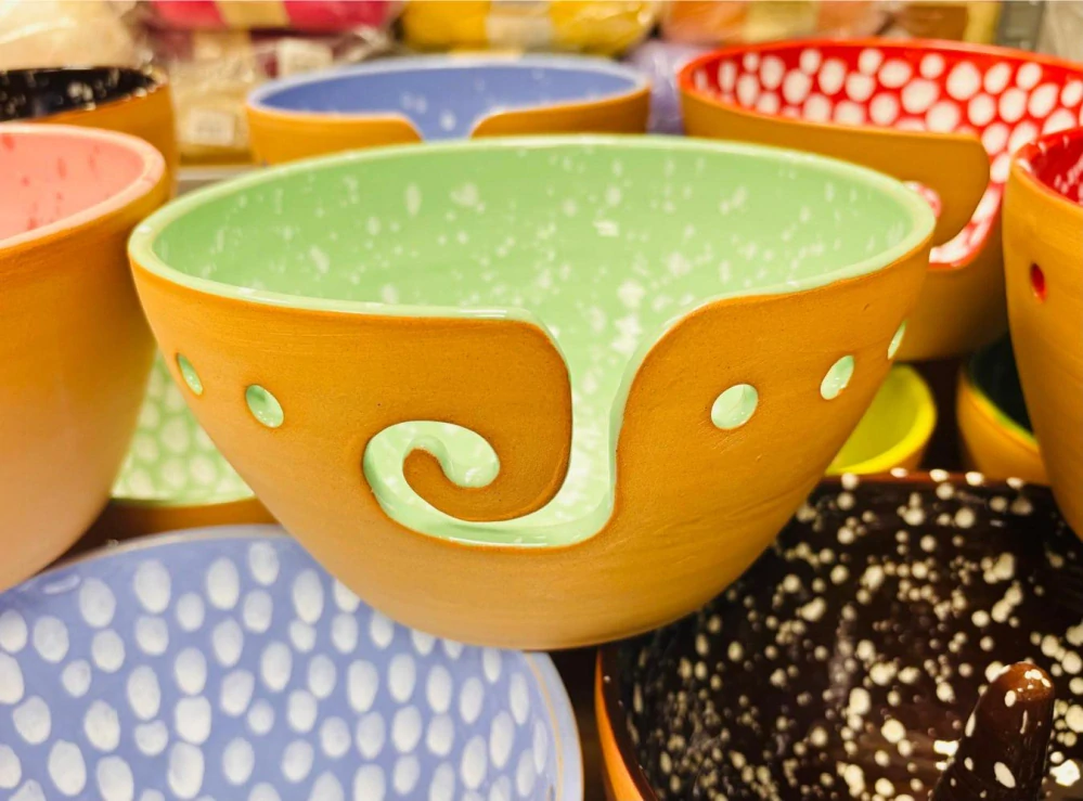 Miska na klubíčka - klubíčkovník - průměr 19,5cm, výška 12cm. Vnitřní glazura zelená s bílýma kapkama.