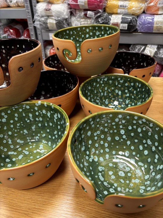 Miska na klubíčka - klubíčkovník - průměr 19,5cm, výška 12cm. Vnitřní glazura zelená s bílýma kapkama.