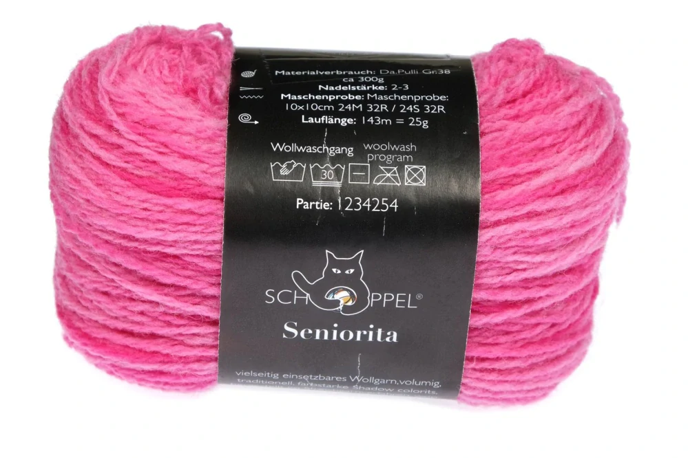 Schoppel Seniorita je příze z 100% merina, která je na nošení velmi příjemná a v úpletu působí lehce a vzdušně. Skvěle vynikne v hladkém úpletu i v jednoduchých strukturách, protože barva dělá část práce za tebe.